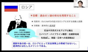 ロシアは過去のソ連の栄光回復を目指しています。欧州には軍事的な対応をしてきたのに対し、極東では経済重視でシベリア・パイプライン構想もありましたが、北朝鮮の政治的リスクが高いことが妨げとなっています。朝鮮半島の統一は、ロシアにとって安全保障上の脅威ではなく、むしろ天然ガス輸出など経済的メリットが大きいと言えます。