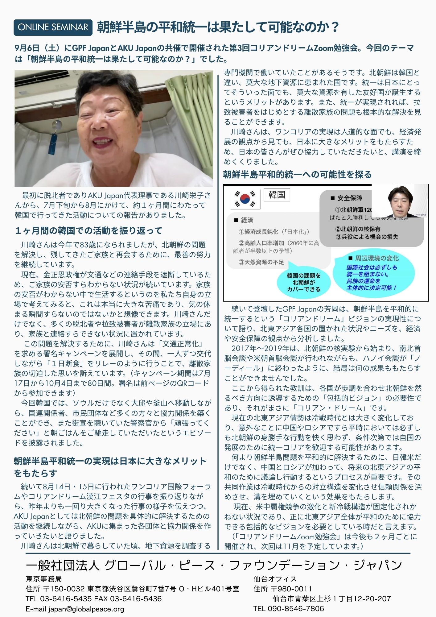 ■9/6(土)川崎栄子さん登壇”朝鮮半島の平和統一は果たして可能なのか?”オンラインセミナーのお知らせ
